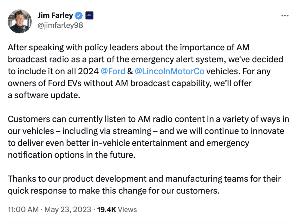 “In light of Ford’s announcement, NAB urges other automakers who have removed AM radio from their vehicles to follow Ford’s lead and restore this technology in the interest of listeners and public safety” said NAB President and CEO Curtis LeGeyt.