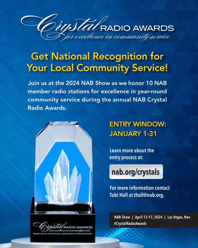 The National Association of Broadcasters (NAB) Crystal Radio Awards provide an excellent opportunity to highlight local radio’s community service efforts around the country. The awards are presented to ten exceptional radio broadcasters and will be presented on the mainstage during a special awards ceremony on Tuesday, April 16 at the NAB Show in Las Vegas. There will be a special workshop for finalists.